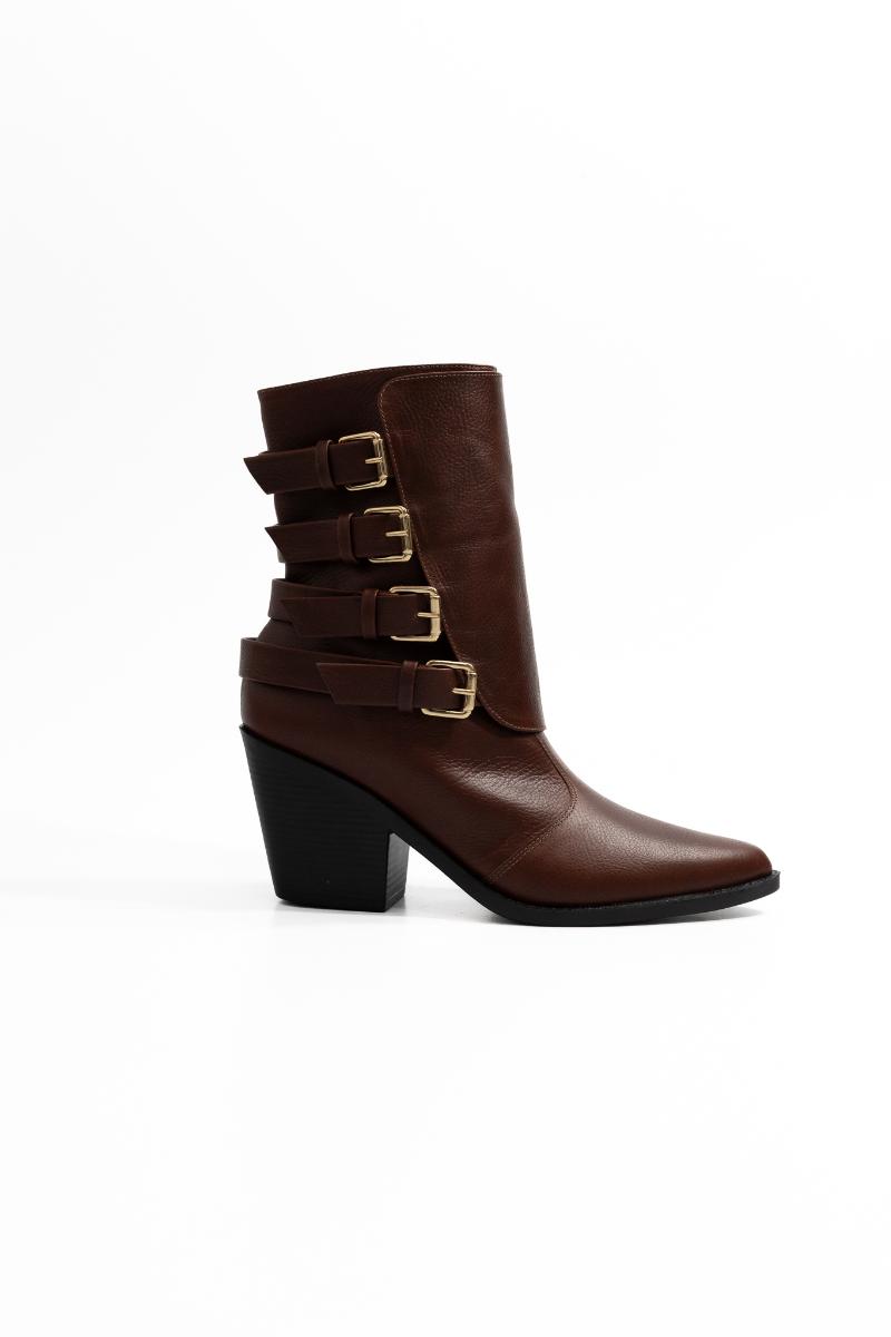 Não tem como passar despercebida com essa bota! O salto bloco e o couro texturizado garantem presença, enquanto as quatro fivelas douradas trazem aquele toque ousado que faz toda a diferença.