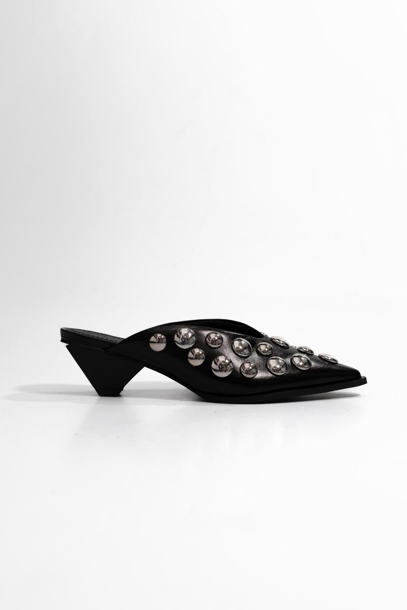 O Mule Vanucia é puro statement: salto arquitetônico que é quase uma escultura + aplicações em chrome balls prateadas que brilham como jóia moderna. Um mix perfeito de design futurista com elegância fresh. Ideal pra quem não tem medo de ousar e ama transformar o look em uma obra de arte.