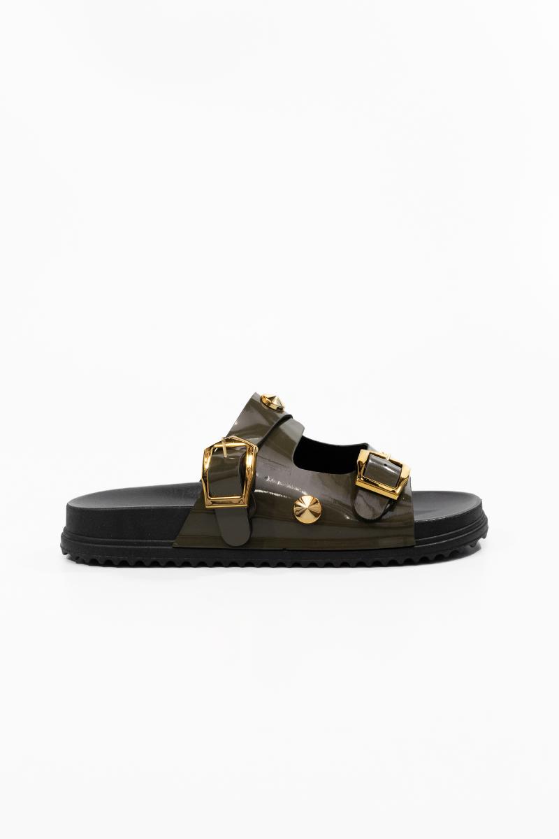 Essa papete verde militar com acabamento brilhoso, fivelas douradas e aplicações metalizadas é sinônimo de atitude. Confortável, estilosa e super versátil, ela eleva qualquer look básico a outro nível. Use com jeans, vestidos ou até alfaiataria e arrase sem esforço!