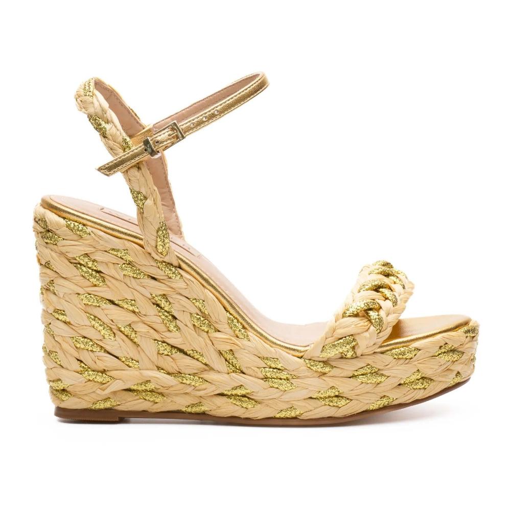 Esta sandália plataforma de salto anabela apresenta detalhes sofisticados em corda trançada, com tons de palha e dourado. Conta com uma tira frontal e fechamento de fivela ajustável no tornozelo, proporcionando conforto e segurança durante o caminhar. Perfeita para compor looks de verão, sua combinação de materiais naturais confere um toque rústico e elegante, tornando-a ideal para ocasiões casuais e descontraídas.