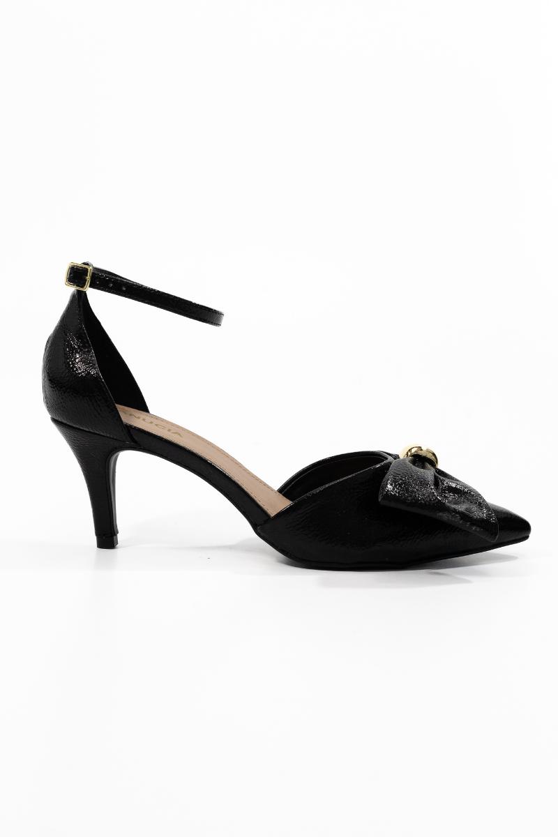 Esse salto é a definição de elegância com atitude. Em verniz preto com detalhe em laço e aplicação dourada, ele vai do office ao happy hour sem perder o charme. O bico fino e o salto médio garantem aquela postura confiante e um toque sofisticado que faz toda a diferença.