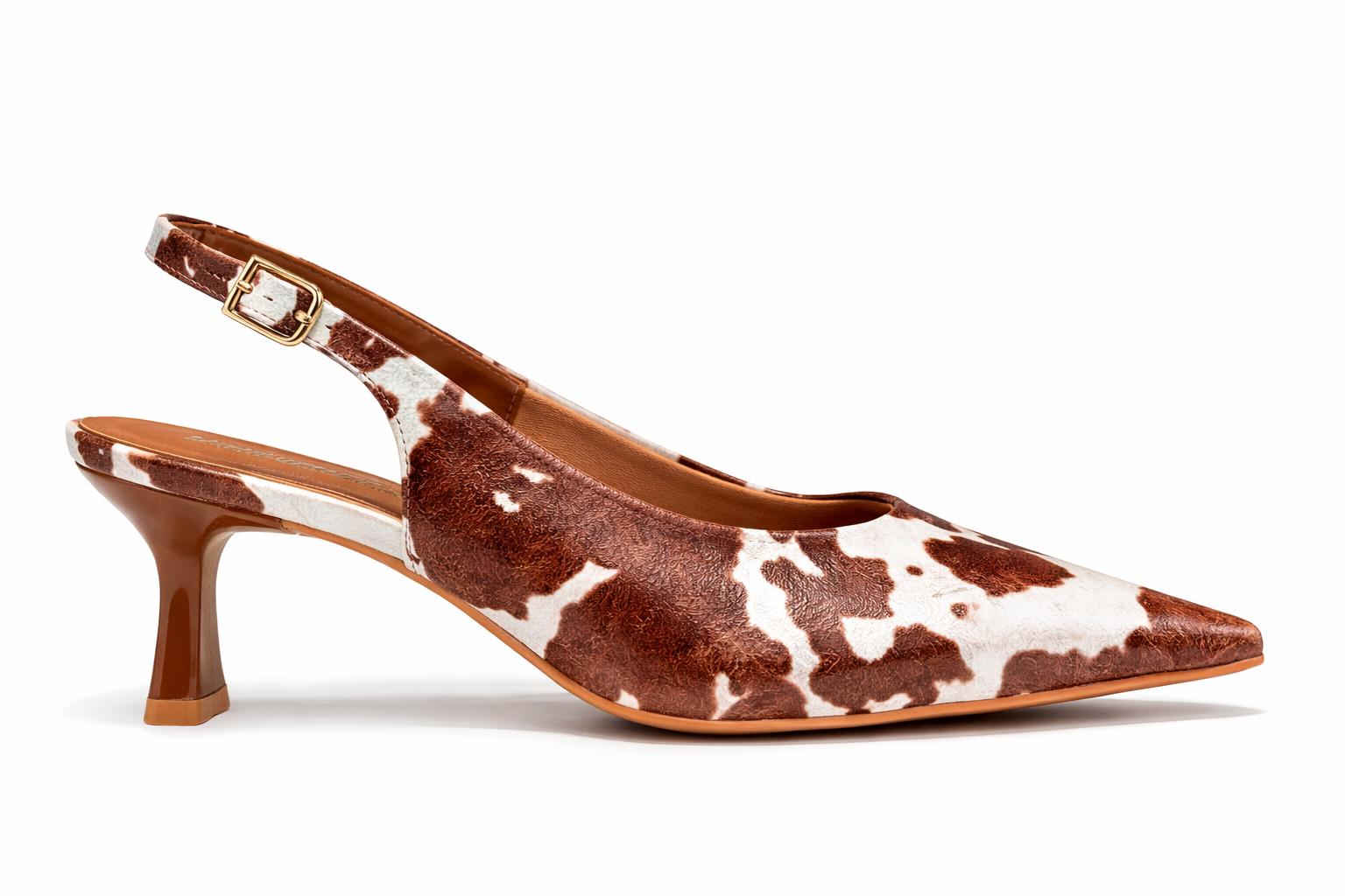 Moderno e cheio de personalidade, este scarpin slingback da Vanucia traz uma estampa animal que transforma qualquer look. O modelo possui bico fino elegante, salto médio e tira traseira com fivela para melhor ajuste.