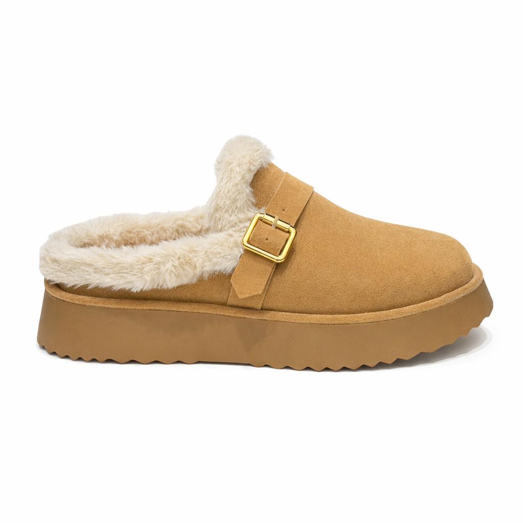 Seu interior forrado com pelúcia macia envolve os pés em uma sensação térmica agradável, ideal para dias frios ou momentos de relaxamento. O detalhe da fivela lateral adiciona um toque sofisticado ao modelo, enquanto o solado plataforma robusto garante estabilidade e presença no look.